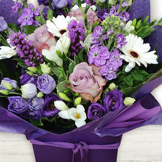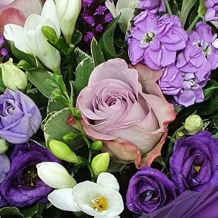 Lush greenery frames lilac roses, violet lisianthus, delicate stock and airy freesias, crowned by white gerbera daisies. A poetic pastel arrangement exuding gentle charm.