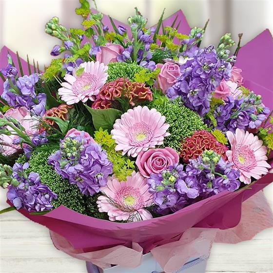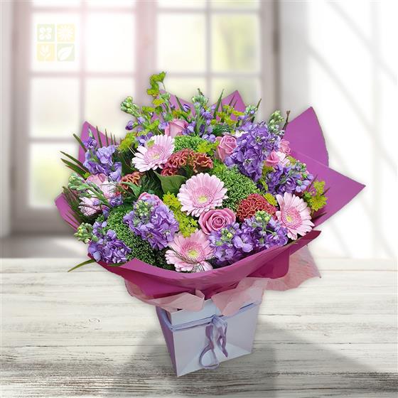 Soft pastel roses and pink gerberas are paired with lavender stock, lime viburnum balls and coral cockscomb, nestled in fresh greenery for an airy, gentle flourish.