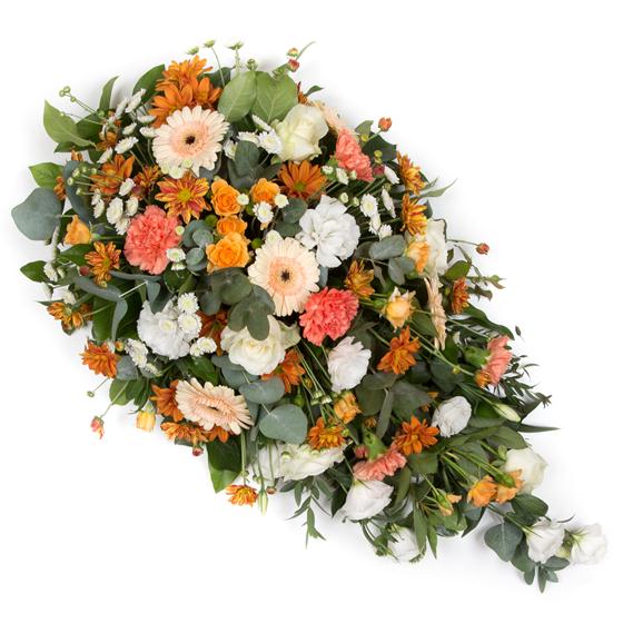 UK flower delivery nationwide by real local florists, Send funeral flowers and order this orange and white single ended funeral spray delivered locally in and around the UK. Order direct and shop local.