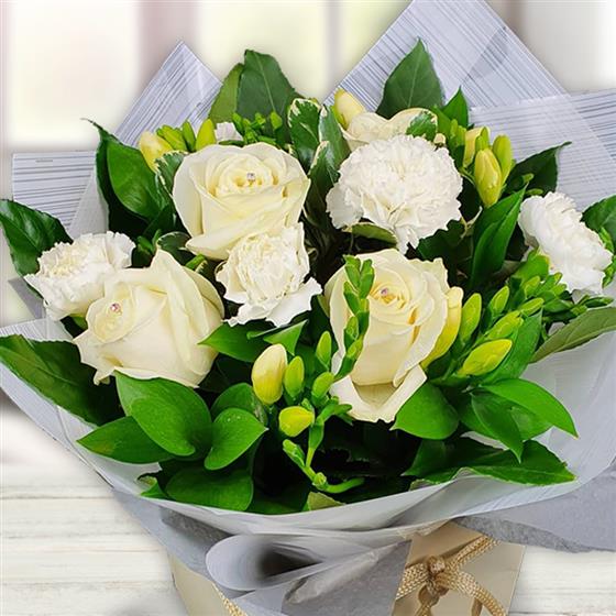 Creamy ivory roses, delicate white carnations and pale freesia blooms entwine with glossy leaves in a minimalistic wrap for understated, timeless beauty.