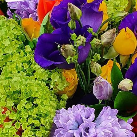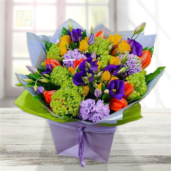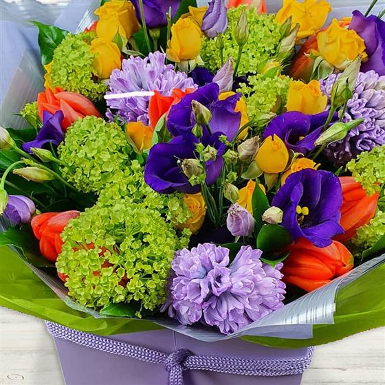Design includes green viburnum-style blooms, lisianthus, tulips, roses and layered seasonal flowers in strong contrasting tones, arranged into a lively bouquet with depth, texture and a confident, modern feel.