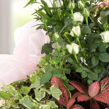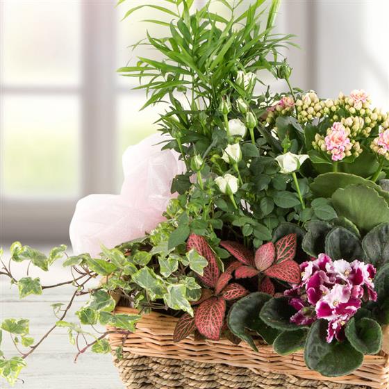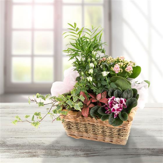 A long lasting gift of seasonal flowering and non-flowering plants presented in a traditional basket.