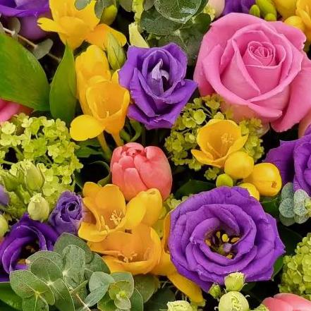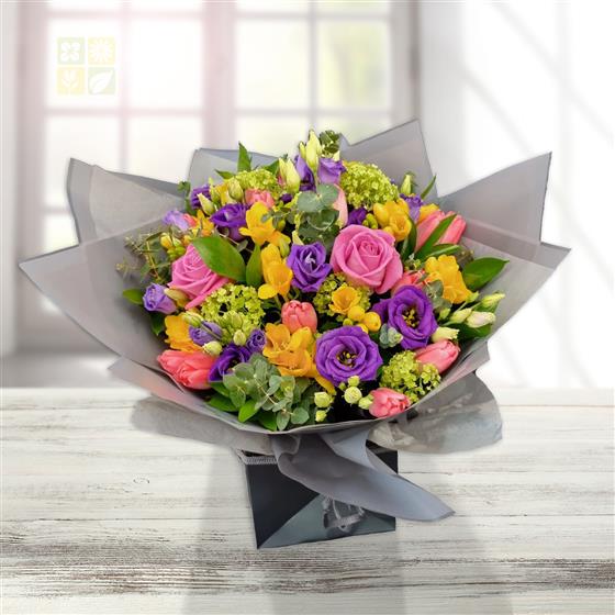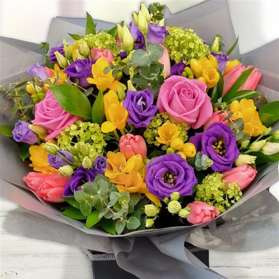 Design includes pink roses, purple lisianthus, yellow freesia, pink tulips, green viburnum, eucalyptus stems and fresh mixed foliage, combined into a lively, colour-packed bouquet with playful rhythm, texture and cheerful contrast.