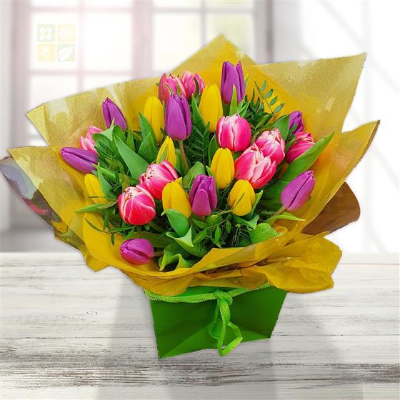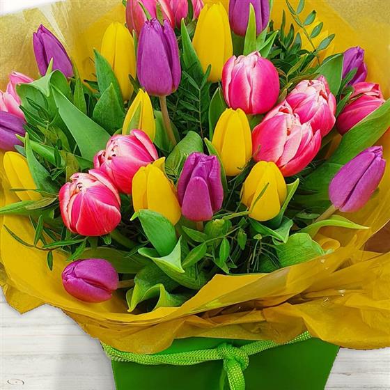 Design includes mixed pink, purple and yellow tulips arranged with fresh green foliage, creating a bright, uplifting bouquet full of spring colour, clean lines and natural freshness.
